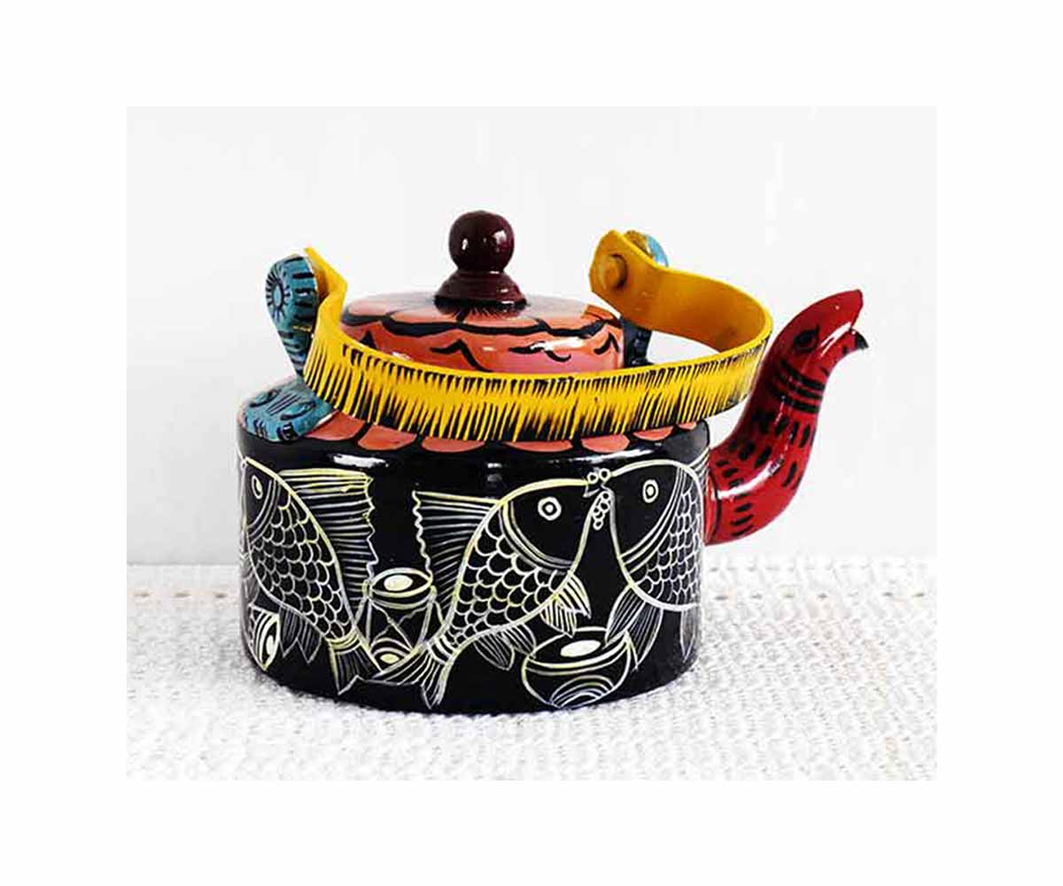 Beautifully painted Pattachitra art on a tin teapot, this piece is also perfect as a unique curio.